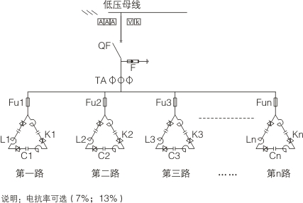 低壓TSC動態(tài)無功補(bǔ)償裝置采用人工智能控制,由控制器、雙向可控硅、電容器、電抗器、保護(hù)元件等組成。控制器實(shí)時跟蹤測量負(fù)荷的功率因數(shù)和無功電流,與預(yù)先設(shè)定的給定值進(jìn)線比較,動態(tài)控制電容器組的投切,以保證功率因數(shù)達(dá)到設(shè)定值。整個測量執(zhí)行過程在一個周波內(nèi)完成(時間<20ms),并實(shí)現(xiàn)可控硅過零觸發(fā),確保投切電容器無沖擊、無涌流、無過渡過程